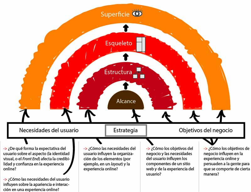 El uso de un diagrama de arco-iris permite expresar las capas que componen el diseño y la experiencia de usuario. Al igual que el diagrama de Jasse James Garret, en la base están las necesidades del usuario y los objetivos de negocio. El siguiente nivel es el alcance de ese diseño. A continuación está la estructura. Le sigue el esqueleto y por último está la superficie. Desde la antropología aplicada a la innovación y al diseño, entender las necesidades del usuario e investigar su experiencia (online, con un producto o en un lugar físico) son los objetivos más importantes para humanizar el diseño.